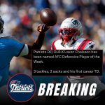🏆 Patriots Linebacker K’Lavon Chaisson Named AFC Defensive Player of the Week New England Patriots linebacker K’Lavon Chaisson has officially arrived. The former LSU standout just earned AFC Defensive Player of the Week honors after a breakout performance against the Tennessee Titans, where he recorded two sacks.Ng1