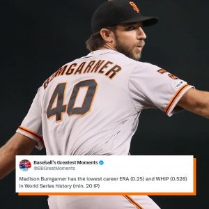 SAN FRANCISCO — There are legends in baseball, and then there is Madison Bumgarner in October. The numbers are staggering, almost impossible to believe in a sport where even the greatest arms eventually bend under postseason pressure. A career World Series ERA of 0.25. A WHIP of 0.528. Twenty-one innings of near-perfection that etched his name forever in the history books.